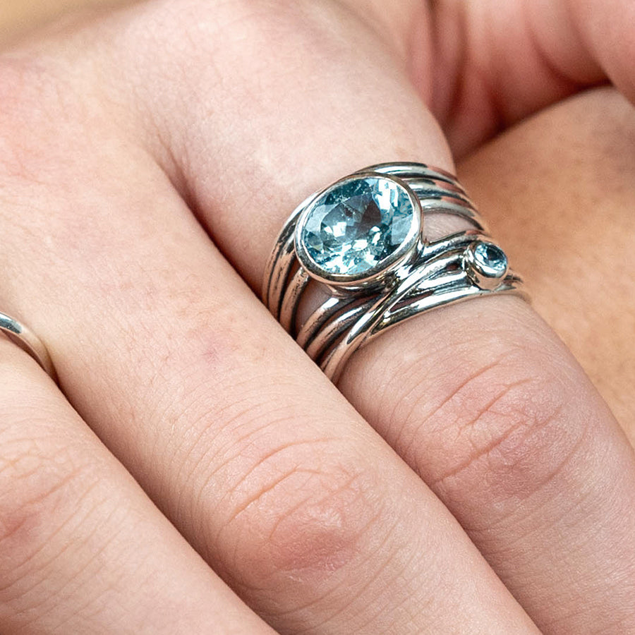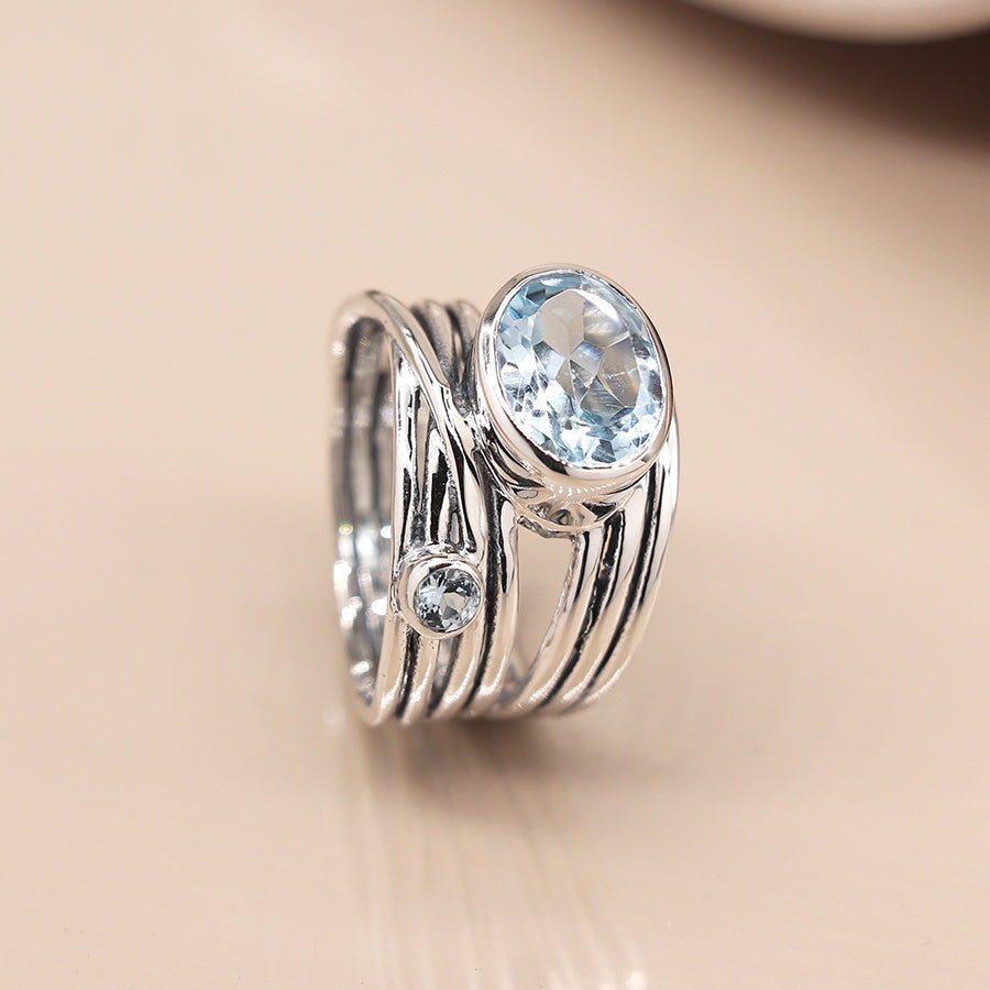 Discover our new new stunning Sterling silver multi strand ring with one large and small faceted blue topaz gemstones.