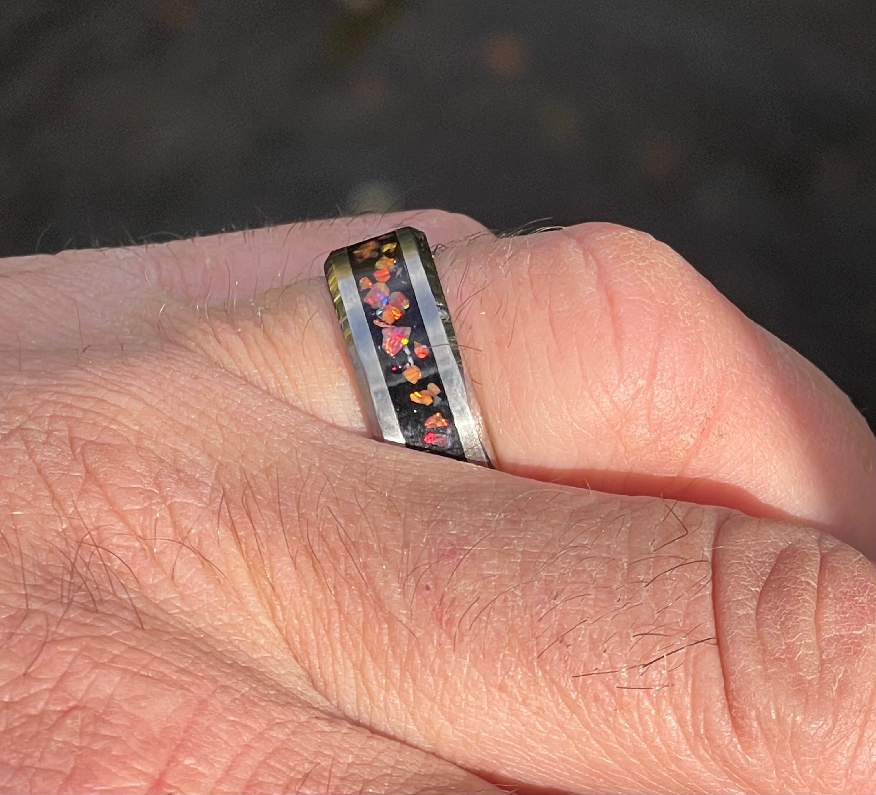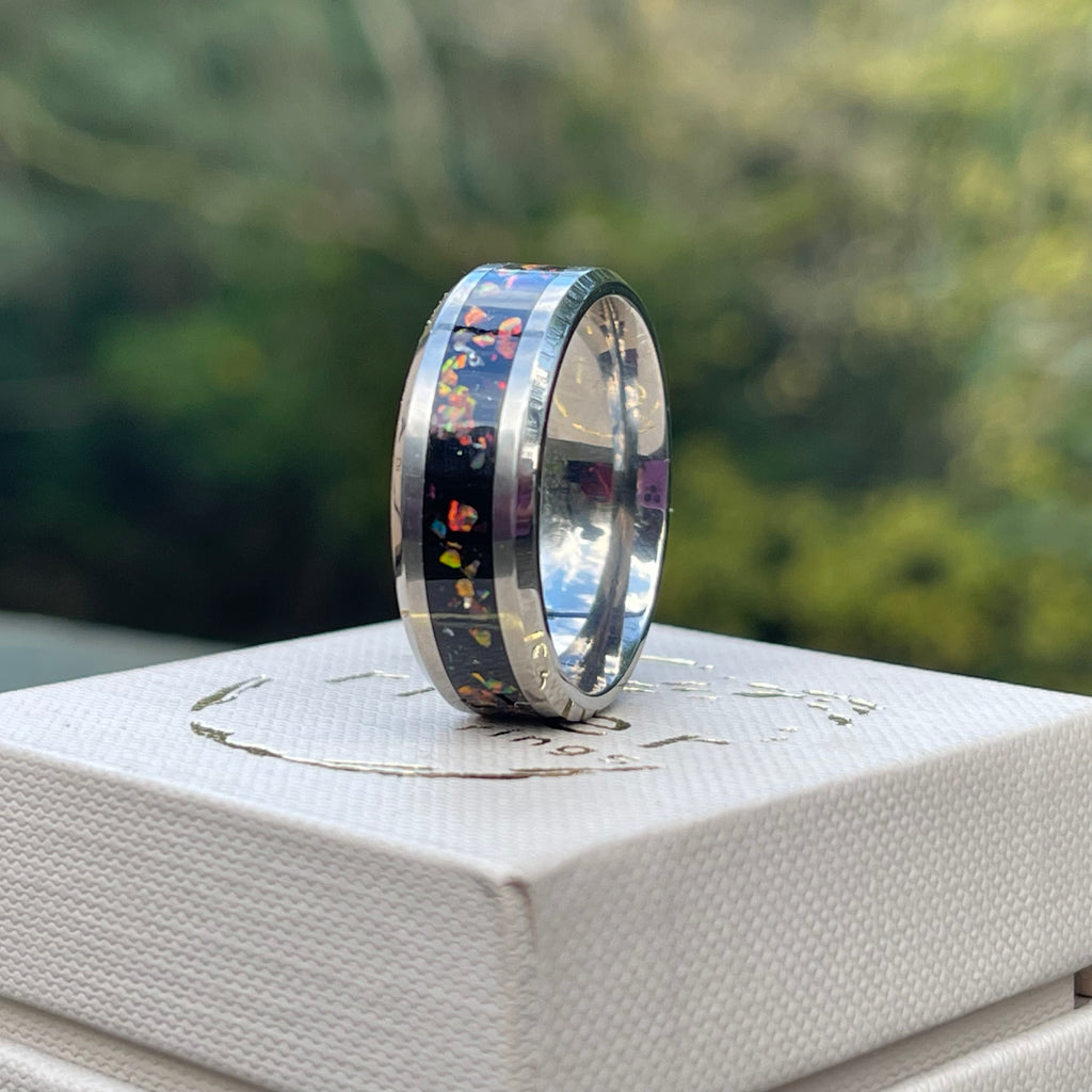 Created by hand, our new Northern Sky River Ring has been inspired by the stunning burnt red sunset, which cast up on lands We have carefully inlaid fragments of Mixed Opal with genuine Whitby Jet to the back to make the colours pop.