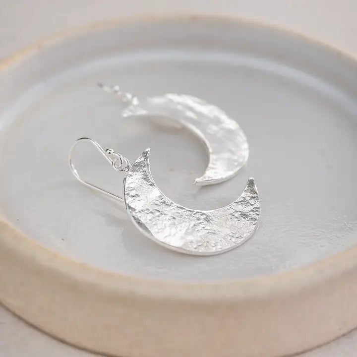 Handmade Sterling Silver Crescent Moon Earrings, Charm size approx. 25mm long, complete with sterling silver ear wires. Displayed on a Lucy Kemp Jewellery Earring Card. All jewellery is handmade using recycled sterling silver where possible.