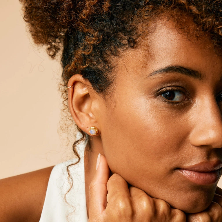 Our Maya Opal Stud Earrings, inspired by the Sanskrit word for illusion, feature removable jackets you can wear with any gemstone studs in our Maya range. They shimmer with sustainably sourced opal gemstones, the October birthstone, and shine with ethical gold plating. Mix, match, and adore.
