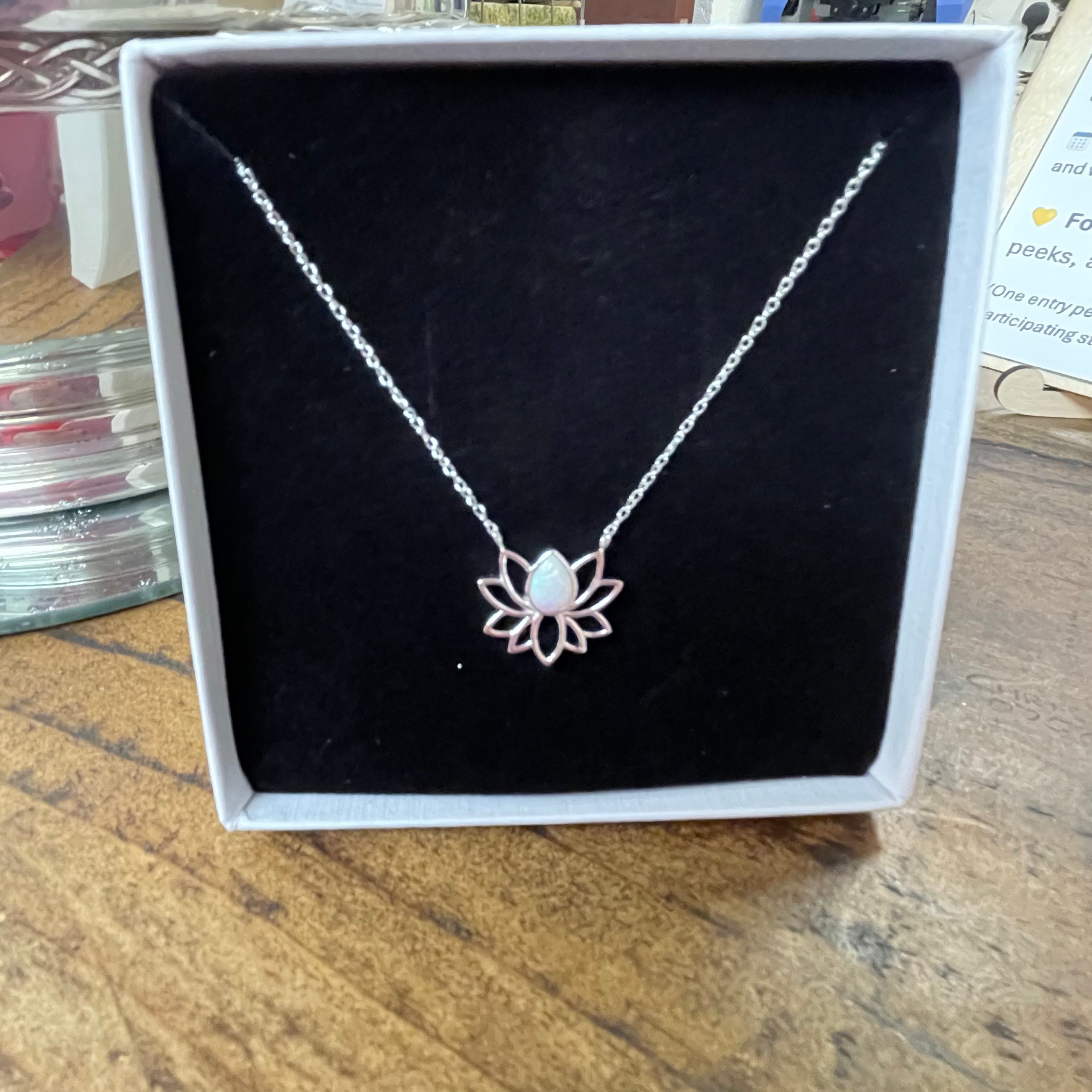 This exquisite Sasha Lotus Flower necklace features a stunning white opalique center set in a delicate sterling silver lotus flower. With a length of 406mm plus an additional 50mm, this piece is sure to add a touch of elegance to any outfit. Crafted with 925 silver, it's both beautiful and durable.