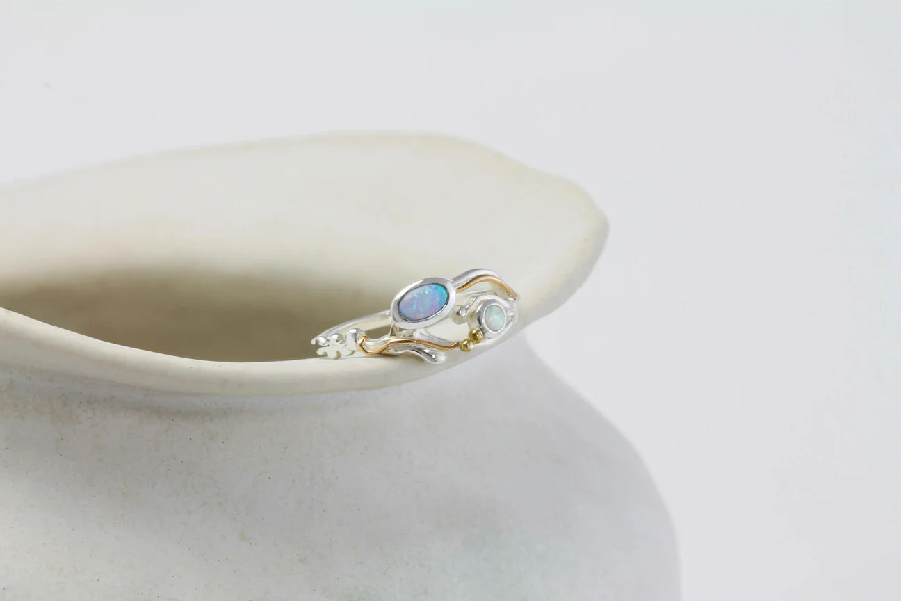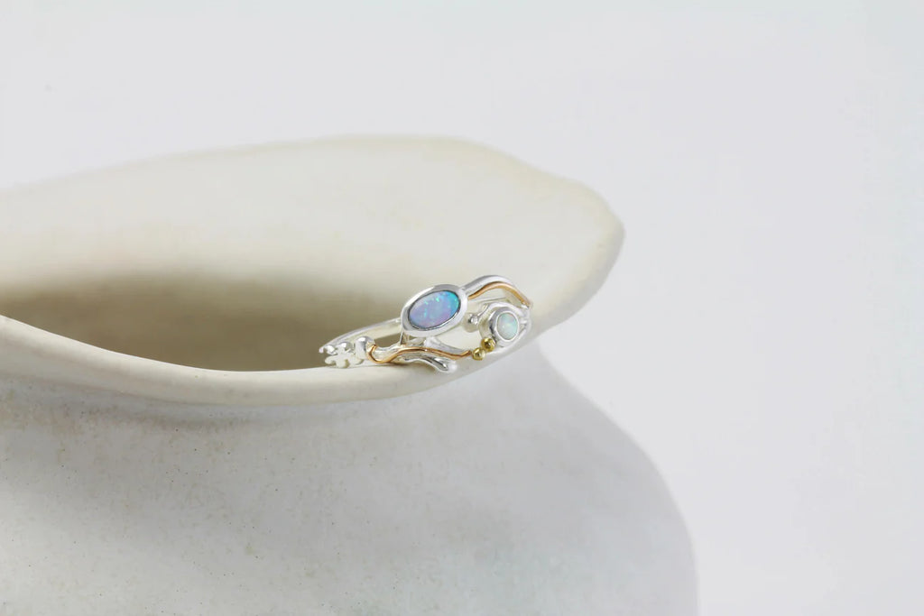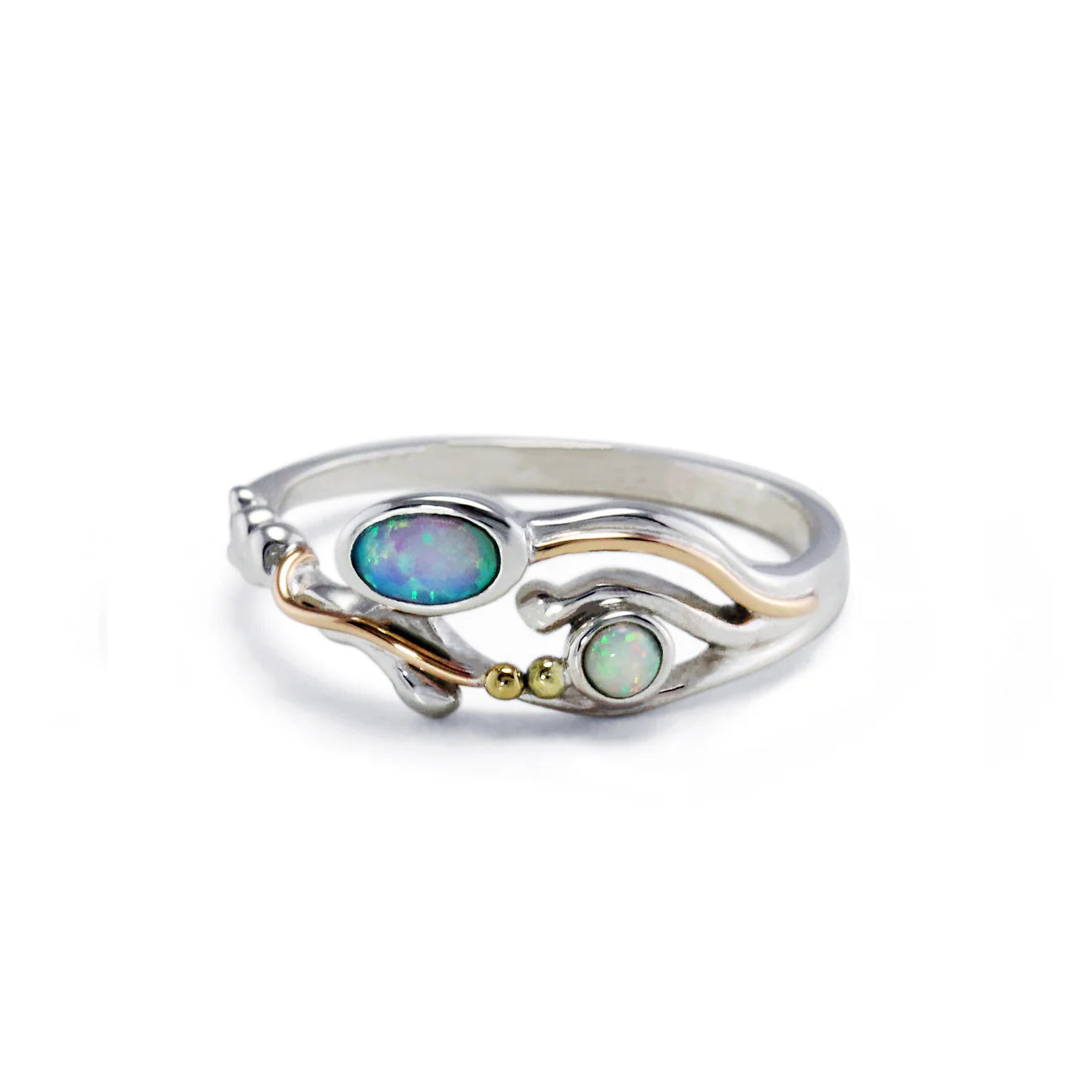 Our newest Opal design-a duo of blue and White grown Opals are set on a flowing design of Sterling Silver, with 14KT Gold and Brass details. Simply beautiful.