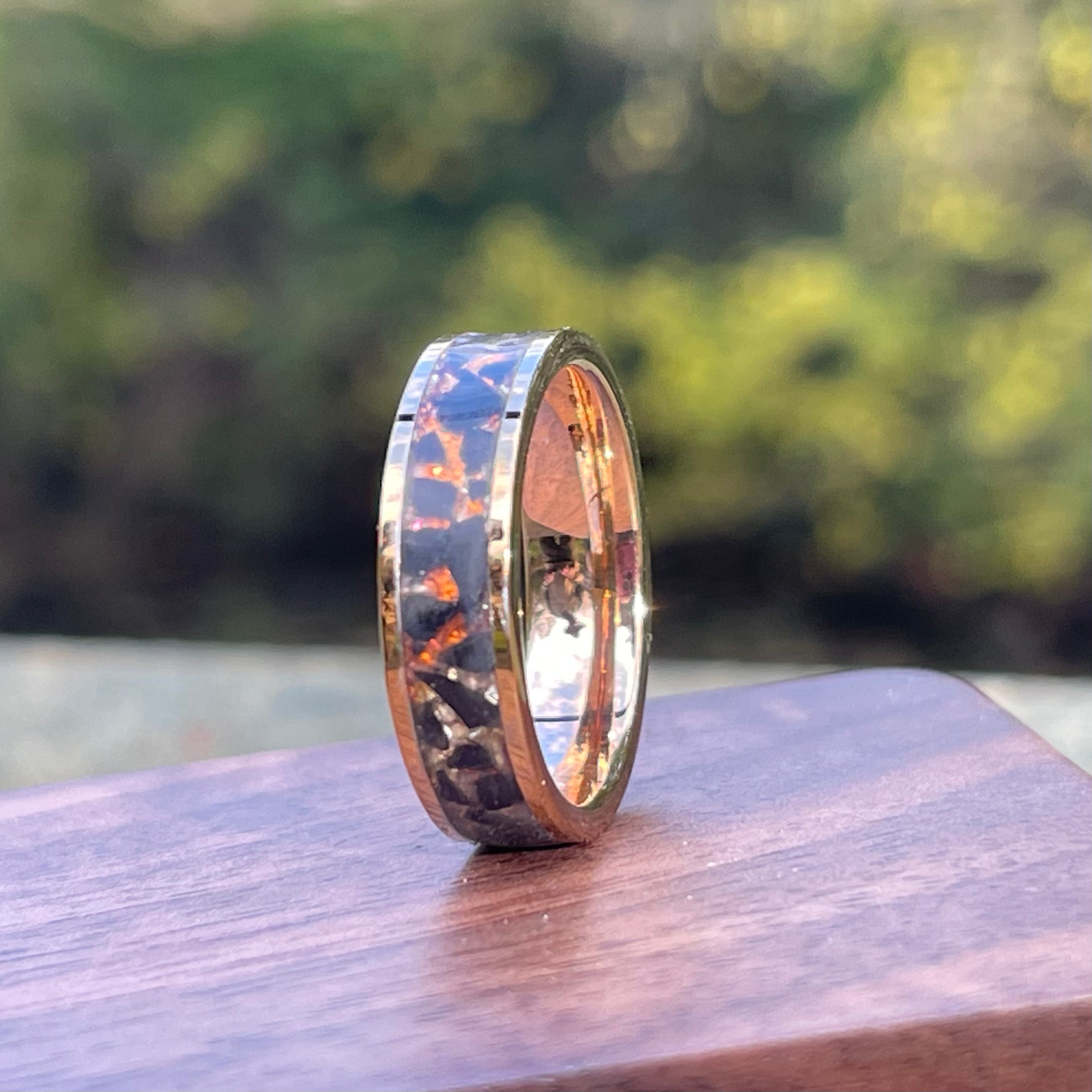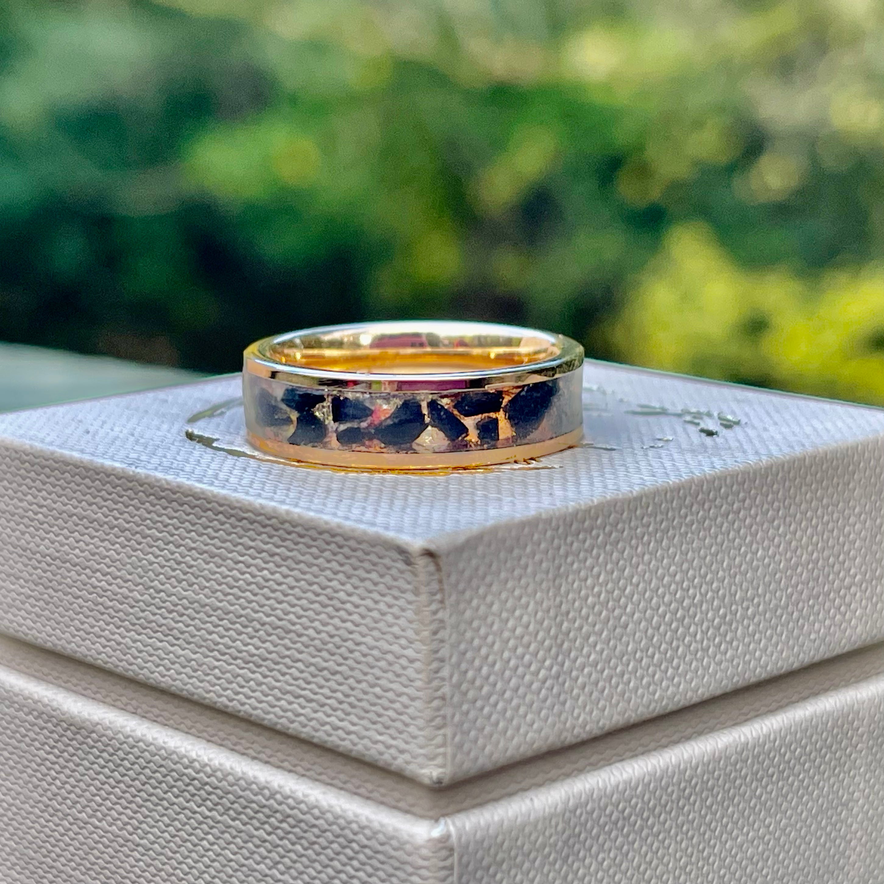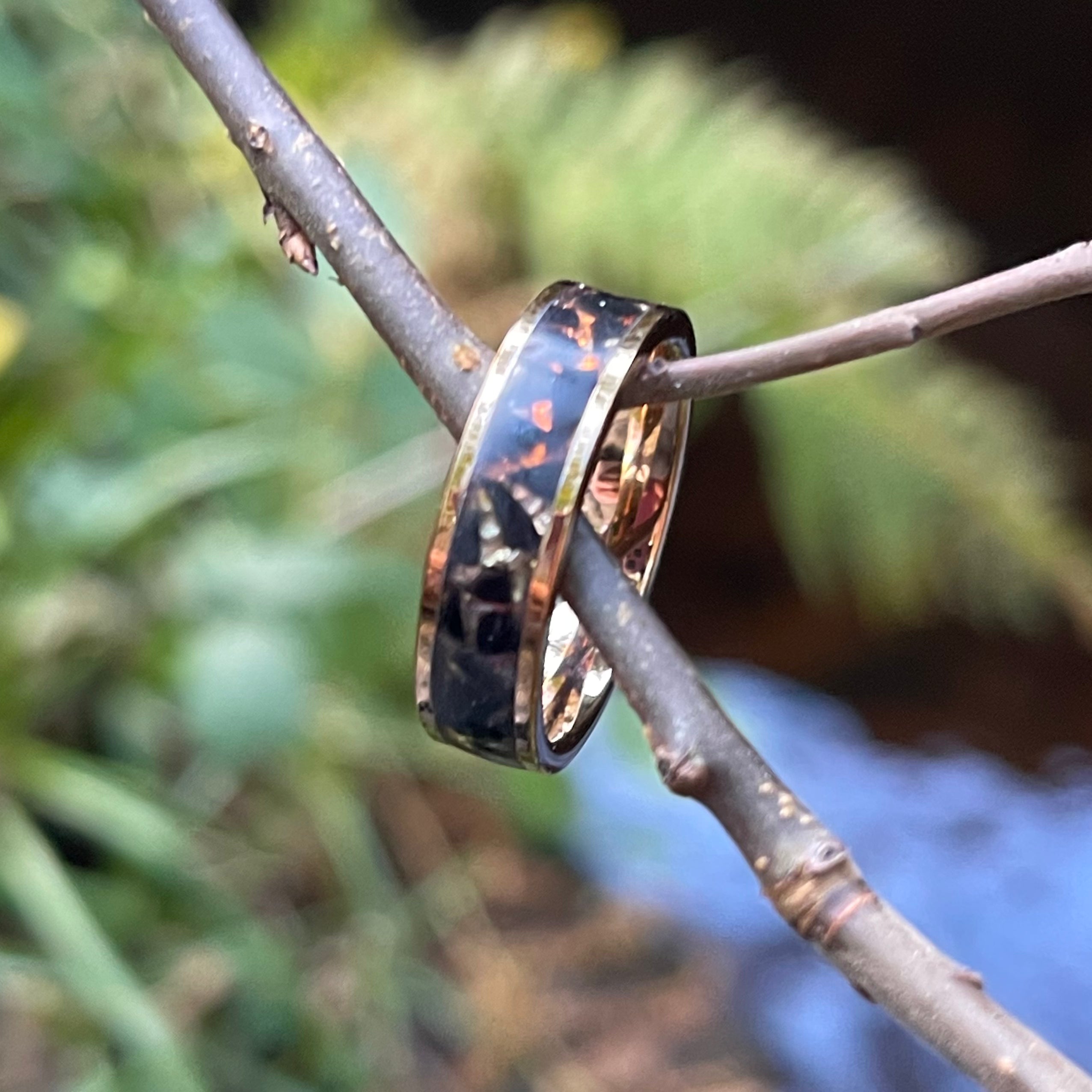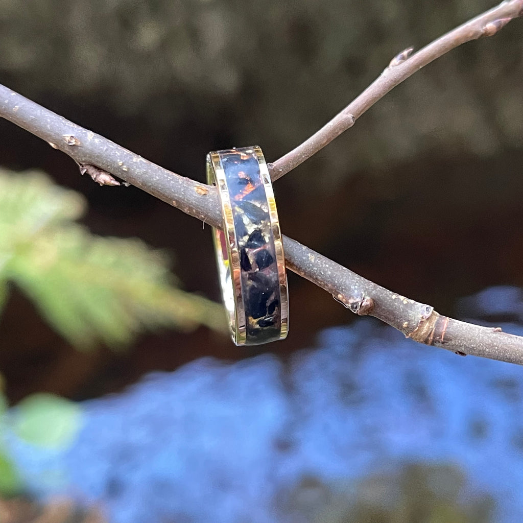Handmade in our Tiny North York Moors studio, we adore our newest addition to our River Rings Collection. The Rose gold Tungsten band has been expertly inlaid with Locally hand collected Whitby jet ad and gold leaf. The ring is 6mm wide.Also available in a yellow gold tungsten band. Please add note at checkout
