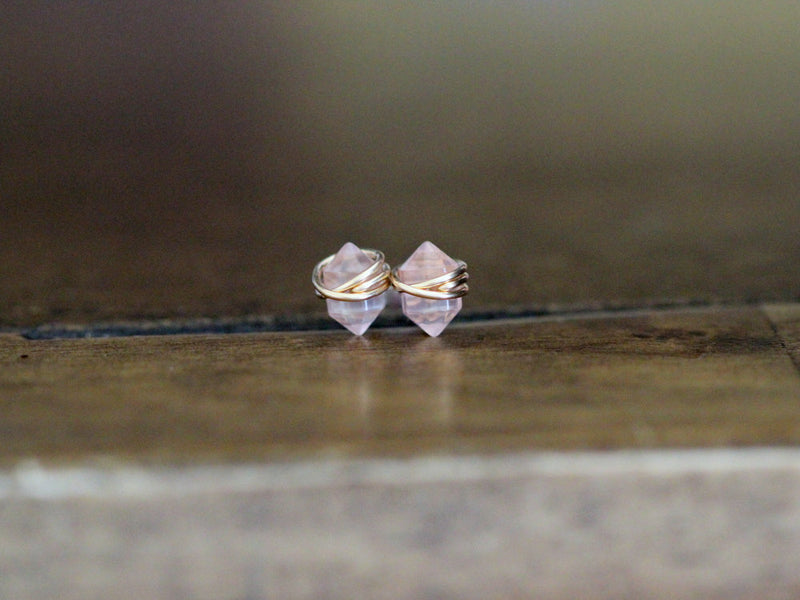Genuine Rose Quartz stones have been secured with 14k Gold Filled wire in my original bezel wrapped style to create studs that can be worn with pretty much everything. These stones have been custom cut to resemble the Herkimer Diamond Quartz stones used in my shop. My unique wrapping style mixed with the unique geometric shape of these stones results in a modern pair of posts that you'll love wearing.