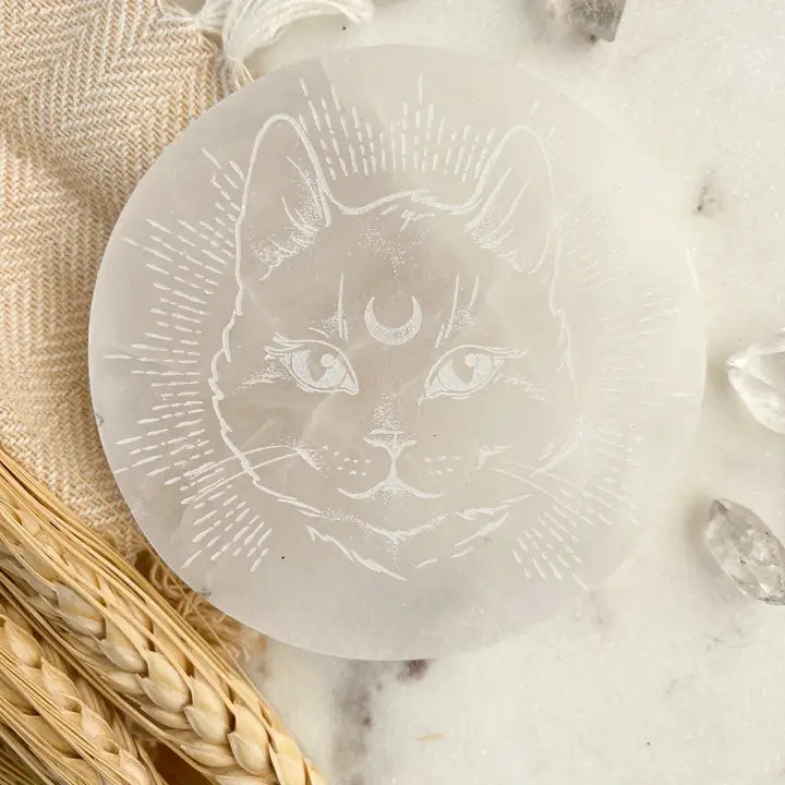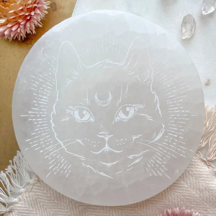 Introducing our beautifully crafted "Midnight Familiar" Selenite Crystal Charging Plate, engraved with a gorgeous Design. This unique and exquisite piece is the perfect addition to your Easter altar, Easter basket, or spring home decor, or easter decor.