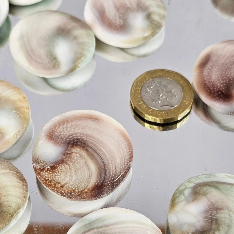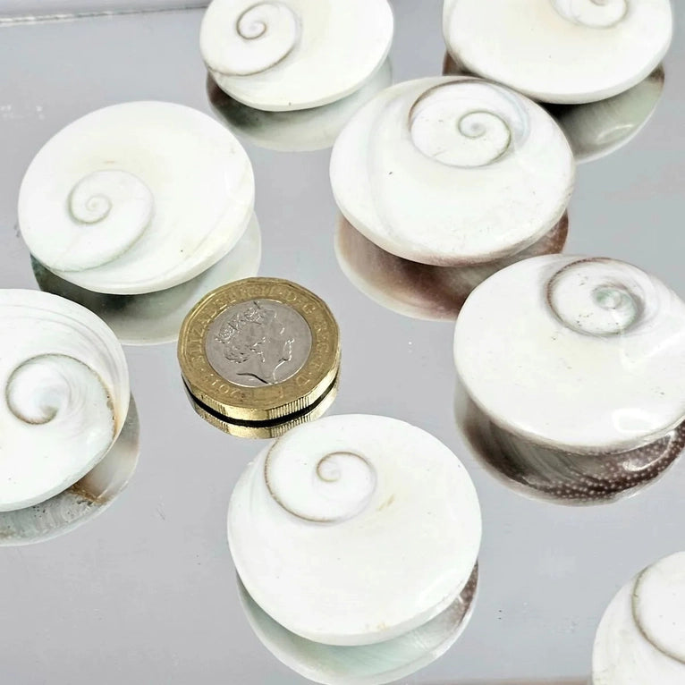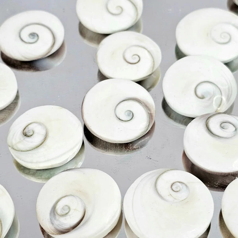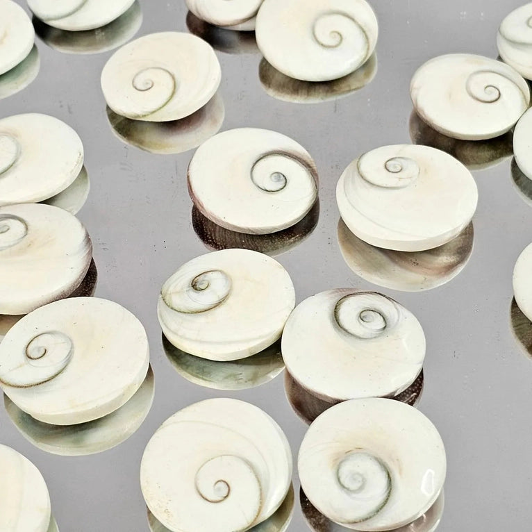 This swirling shell is actually the protective door of the opening from a Turban snail's shell, which detaches at the end of the snail's natural life. Average Size 3cm Location: Madagascar Beliefs: The Shiva Eye shell has a number of meanings associated with it. Eyes in general are a symbol of protection as to ward off the “Evil Eye”.